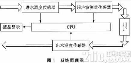 热量表主要由3部分组成:进/出水温度传感器、超声波测量传感器和数据处理芯片(CPU)。系统原理图如图1所示。