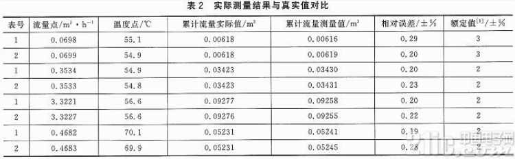 从批量生产的热量表中随机抽取2套作为被测试的热量表,超声波热量表公称口径为DN25。功耗的测量是通过FLUKE 15B对热量表进行测试,结果如表1所列。流量测试是在热量表检定装置RJZ1525Z上进行的,测试流量点是按照行业标准CJ1282007对出厂测试的要求选取的,温度点选取了55 ℃和70 ℃。测试结果如表2所列。