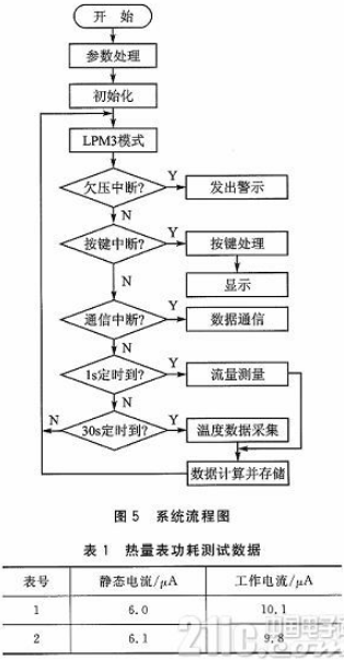 系统软件是在IAR For MSP430环境下用C语言进行编写的,系统流程图如图5所示。首先系统进行数据初始化,包括TDCGP21初始化、时钟初始化等。之后进入主程序,CPU进入低功耗LPM3模式,等待中断唤醒。若检测到电源电压较低,则进入欠压中断,停止对流量和温度的数据采集,并报警提示电压过低。若检测到按键中断触发,则进入按键处理程序,根据按下按键的次数,相应地在LCD上显示当前所用热量、进水温度以及出水温度等内容。从功耗和测量精度综合考虑,流量和温度数据分别间隔1 s和30 s采集一次,为获得更好的测量精度,每次测量前都初始化一次TDCGP21。为方便用户查询,程序设计为自动将最近18个月的数据存入Flash中。