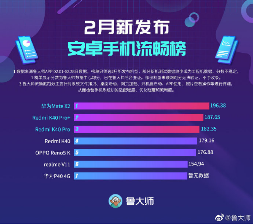 1、榜单数据来自鲁大师安卓APP 2月1日-2月28日的数据,榜单只筛选在这期间新发布的机型。部分新机测试数据较少或为工程机数据,分数不稳定。