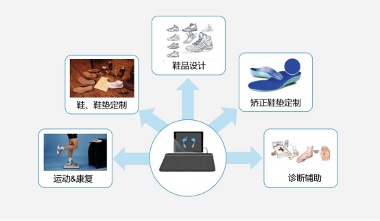 并且,该系统有别于传统足部测量方法,通过高精度压力传感器及智能化软件算法,可精准计算脚底压力值、压力分布均衡度、脚长、脚宽、足弓指数,为鞋品设计、鞋品定制、鞋垫定制、矫正鞋垫定制、各类足部疾病诊断提供一对一全方位数据依据。