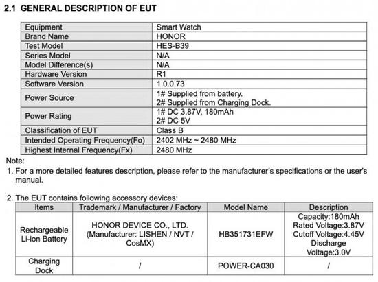 我们还发现,荣耀智能手表HES-B39的电池型号为HB351731EFW。根据其TUV莱茵和DEKRA认证页面显示,它的容量为180mAh。同样,荣耀智能手环CRS-B39S使用的是一块代号为HB351329ECW的100mAh电池。至于ARG-B39健身带,其电池容量为180mAh。该列表还指出,相关样品是智能手表的生产型号,表明它们可能很快就会推出。FCC认证是一款产品在上市前必须经过的关键步骤之一。