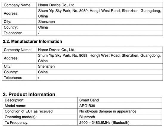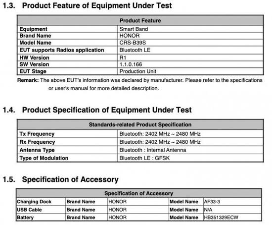 FCC相关内容还提到了荣耀 Smart Band ARG-B39健身追踪器,这意味着这款机型也在研发中。荣耀智能手表HES-B39和智能手环CRS-B39S的FCC清单还告诉我们,前者将通过蓝牙与连接设备对接,而后者也支持蓝牙LE。
