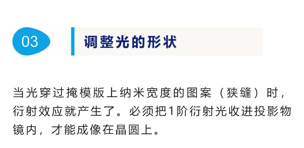 上面我们讲到,经由照明模组”加工”后的光,穿过掩模版上纳米宽度的图案(狭缝),产生衍射效应而后向外发散。