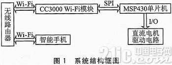 本系统的结构框图如图1所示。系统总共分为5部分,分别是:无线路由器、智能手机、CC3000 Wi—Fi模块、MSP430单片机电路和直流电机驱动电路。首先,智能手机将Wi-Fi连接到无线路由器;接着打开智能手机中的SmartConfig的APP,配置CC3000 Wi—Fi模块,这样CC3000即可连接到无线路由器;然后打开电机控制APP,建立智能手机和CC3000 Wi—Fi模块的连接。其中,CC3000 Wi—Fi模块与MSP430单片机是通过SPI总线进行通信的。最后,可以通过智能手机中的电机控制APP对电机进行无线控制。