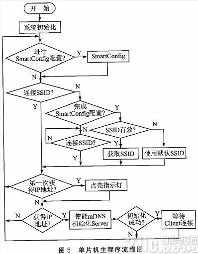 单片机主程序流程图如图5所示。将CC3000作为Server,等待智能手机连接。单片机首先进行I/O口的初始化以及一些寄存器的配置;接着判断CC3000是否需要进行Smart Config,如果不需要,再判断是否已经连接到一个无线路由器,CC3000连接上路由器后,就会获得一个IP地址;然后CC3000发送广播以及初始化CC3000为Server模式,等待Clie nt连接。当智能手机收到广播,与CC3000连接上之后,就可以通过智能手机控制直流电机了。