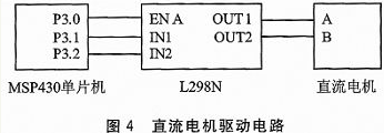 直流电机驱动电路如图4所示。通过单片机的P3.0输出占空比不同的PWM波形来调节直流电机的速度,通过P3.1和P3.2引脚的高低电平不同来控制直流电机的旋转方向。