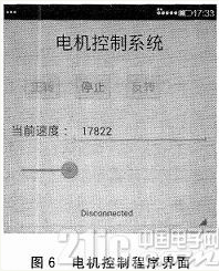 电机控制程序界面如图6所示。该程序主要实现智能手机连接CC3000 Wi—Fi模块,以及控制电机的正转、反转、停止和速度。界面中的3个Button组件是用来控制电机的正转、反转和停止。通过滑动SeekBar组件,可以调节电机的速度,并在该组件的上方显示出速度大小。最下面的Spinner组件用于显示连接的设备,当连接上CC3000后,会在此处显示出来。