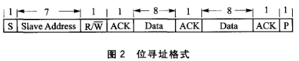 7位寻址的格式如图2所示,第一个字节包括7位从地址和一个R/W 读写控制位。应答位ACK是接收方在每个字节后发出的握手信号。