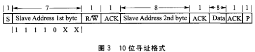 10位寻址的格式如图3所示,第一个字节由11110b加上10位从地址的高两位和R/W 位构成。每个字节结束后,由接收方发送ACK应答信号。下一个字节是10位从地址剩下的8位数据,在这之后是ACK应答信号和8位数据。
