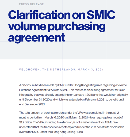 VPA下的采购订单总额在2020年3月16日至2021年3月2日期间过去的12个月中完成,总计12亿美元。VPA对于ASML而言不是重要事件。我们了解,根据香港上市规则,VPA构成中芯国际的可披露事件。
