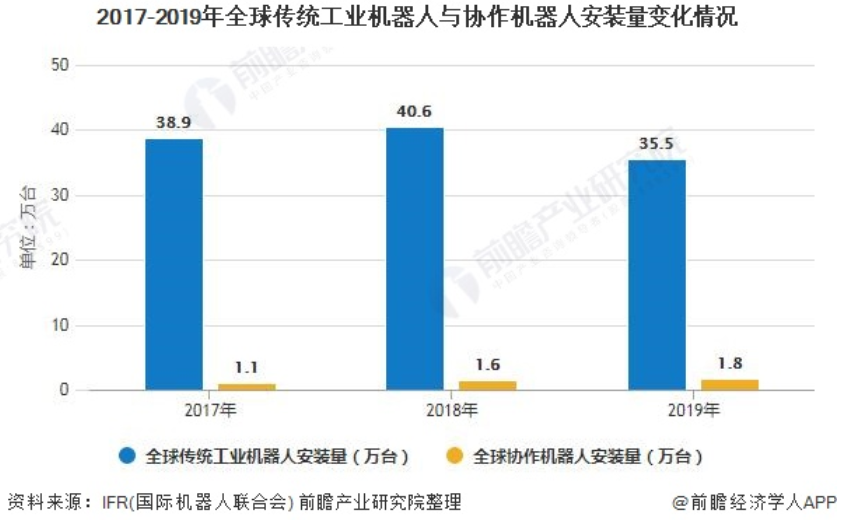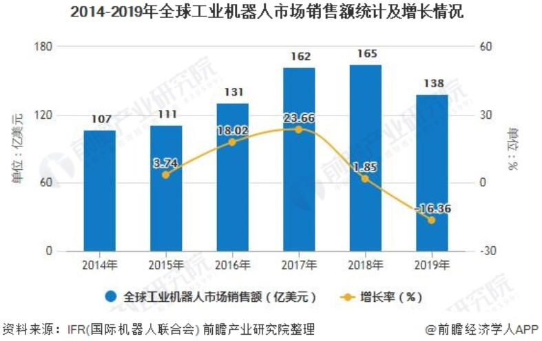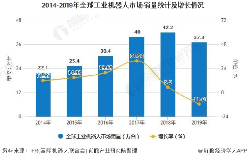 目前,全球工业机器人市场处于长期稳健增长阶段,但2019年全球经济下行和贸易摩擦给机器人行业带来了一定影响。