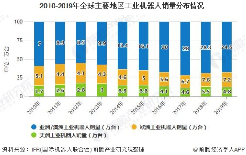 由于中国,日本和印度等发展中国家汽车工业的蓬勃发展,亚太地区是世界上最大的工业机器人生产国和雇主。在亚洲,新安装的机器人份额约占全球供应量的2/3,2019年亚洲/澳洲工业机器人销量达24.5万台;欧洲是工业机器人的第二大市场,2019年销量为7.19万台;美洲工业机器人市场份额最小,2019年销量为4.78万台。