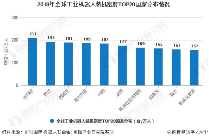 从机器人的装机密度看,2019年全球工业机器人装机密度为113台/万人,新加坡和韩国是机器人装机密度最高的市场,每万人机器人装机数量分别达到918台和855台,而在需求量最大的中国市场这个数字只有187台,远落后于发达国家,未来仍有较大提升空间。