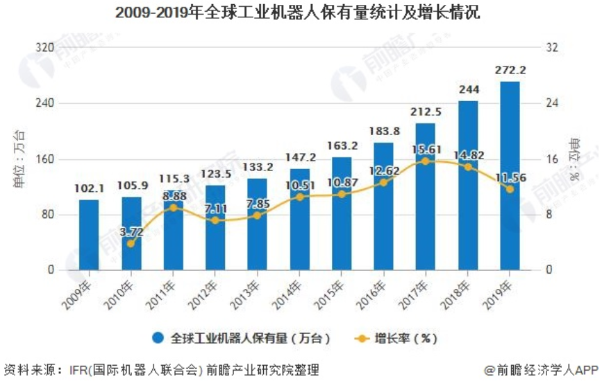 根据国际机器人联合会(IFR)最新数据统计,截至2019年底,全球工业机器人保有量达272.2万台,同比增长11.6%。