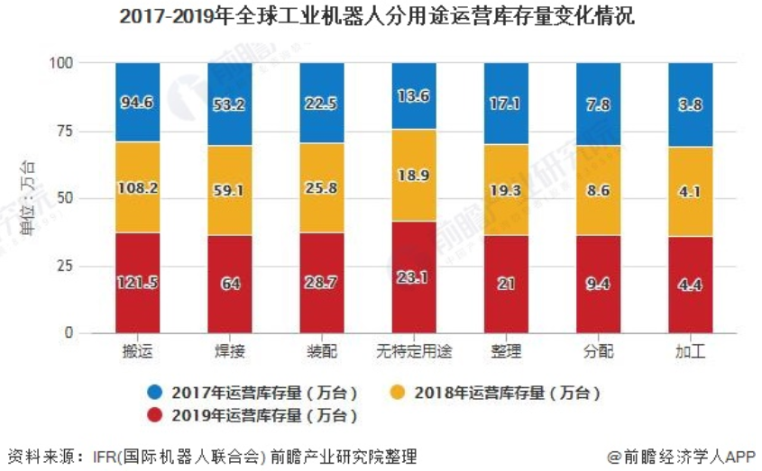 按用途来看,2019年,工业机器人数量部署最多的用途是搬运,运营总量达121.5万台;其次是焊接,运营总量达64万台;此外,全球工业机器人被广泛用于装配、整理和分配等。