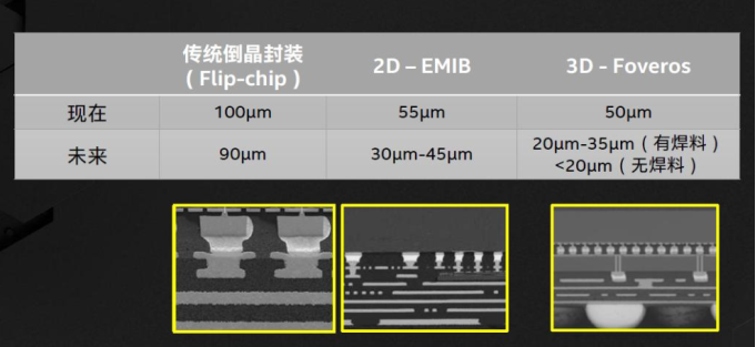 由于采用3D堆叠,Foveros的封装密度、集成度都更高。2D EMIB封装裸片间距可以做到55微米,未来也只能缩微到30-45微米,3D Foveros现在就能实现50微米间距,未来还可进一步降至20-35微米(有焊料),甚至是20微米以下(无焊料)
