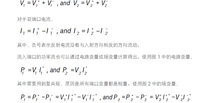 考虑到电路变量是正反向传播波幅度的叠加,因此图 1 所示的电路变量与图 2 所示的场变量之间的转换是完全可能实现的。对于双端口电压,