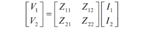 由于变量数量增多(现在为四个),双端口网络需要更复杂的表征方法,有多种矩阵方法可以使用。一种方法是阻抗矩阵,或称为 Z 矩阵。用 Z 矩阵表示双端口网络时,可以将两个端口电流(I1 和 I2)视为独立的激励,将两个端口电压(V1 和 V2)视为由这两个激励引起的响应。如果写出来,阻抗矩阵关系就是: