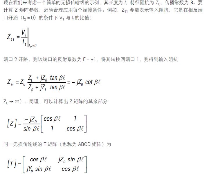 无损传输线的 S 矩阵与 Z 矩阵或 T 矩阵相比更为简单,这就意味着,当场和波更适合描述一个系统时,使用散射参数更实用。