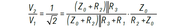 举例来说,考虑为 Z0 = 50 Ω 的传输线设计一个 −3 dB 的衰减器。该器件需要将发射功率减少至原来的 1/2,100.3 = 2,因此,从输入到输出的分压必须是因数 1/√2 = 0.707。图 3 中的电路有两个分支回路,当端口 2 使用的终端为匹配的负载 ZL = Z0 = 50 Ω 端接时,每个分支回路的分压要求:
