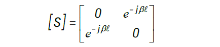 散射矩阵的非对角元素代表从一个端口到另一个端口的发射。电压波从端口 1 进入并从端口 2 离开的过程将会产生一个时延,称为相位因数,它与传输线的长度成正比。相位时延因数 e−jβl 是沿传输线任一方向发生的散射参数,S12 或 S21。因此,无损传输线的散射矩阵是