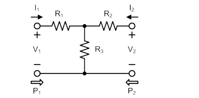 我们再举一个示例,考虑传输线衰减器非常常见的情况。这是一个双端口网络,其用途是让信号通过时按照固定的量衰减,同时信号在任何方向上的传播都不会引起反射。这些通常形成 π 型或 T 型截面(图 3)。