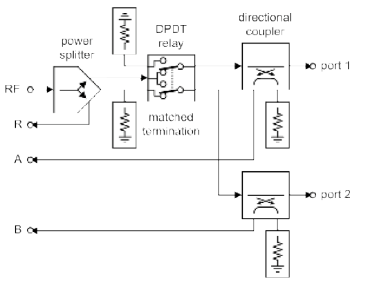 上面显示的 T/R 测试仪足以测量任何网络的任何散射参数,但实际上,测量过程中需要多次连接和断开连接器,非常繁琐费时。更好的办法是通过电子化和自动化的方式完成这个工作。图 5 所示的完整 S参数测试仪增加了另一个定向耦合器,用通道 A 和通道 B 分别测量端口 1 和端口 2 输出的信号。该测试仪还增加了一个双刀双掷(DPDT)开关继电器,用于将射频激励信号导向端口 1 或端口 2,同时通过负载端接让另一个端口保持正确的阻抗匹配。