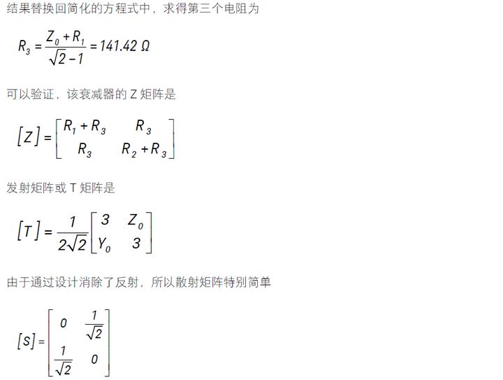 首先应该指出,衰减器不仅仅是一个插入到传输线中的电阻,因此输入阻抗和输出阻抗不再是 Z0,而这将会引起不必要的信号反射。需要用 3 个电阻来构建衰减器,理由是有三个单独的要求必须满足。从一个端口到另一个端口的电压分压系数必须产生预期的衰减系数,并且每个端口的输入阻抗必须是当相反端口使用负载正确端接(ZL = Z0)时的线路阻抗。