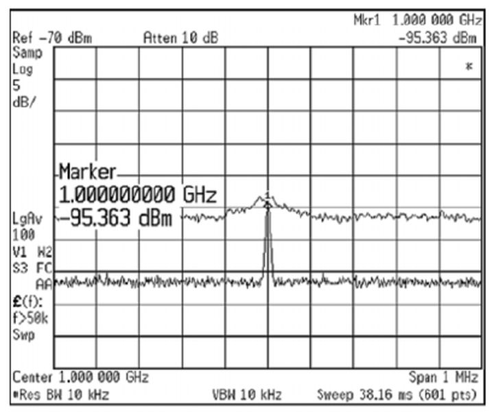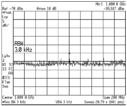 通过低电平信号的测量,可以看到使用窄分辨率带宽RBW的优点。在使用窄RBW时,频谱分析仪显示出较低的平均噪声 (DANL),且动态范围增加,灵敏度有所改进。在图1中,把 RBW 从100 kHz改变到 10 kHz将能更好地分辨 -95 dBm 的信号。