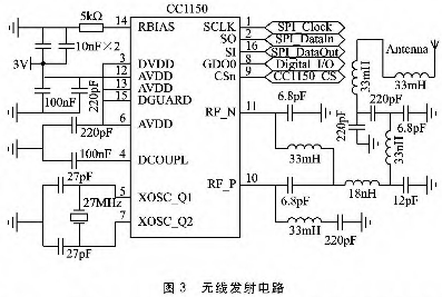 无线发射模块以TI公司生产的低功耗单片UHF无线发射器CC1150为核心。CC1150工作电压为1.8~3.6 V,发射功率10 dB下最大电流消耗为26 mA,支持300~348 MHz、400~464 MHz和800~928 MHz三个频段的UHF信号发送,支持曼彻斯特编码和ASK、OOK等多种调制方式。无线发射电路如图3所示,MSP430F149通过SPI接口将采集的水质数据写入CC1150的数据缓冲区,采用3 V电压经过滤波电路后为芯片供电,信号通过平衡不平衡转换电路和π型网络由天线发射出去。