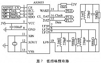 低频唤醒模块以奥地利微电子公司生产的超低功耗低频接收芯片AS3933为核心。AS3933在休眠模式下,最大工作电流为0.2 μA;接收模式下,最大工作电流为6.7 μA;工作电压为3 V。内部集成3个天线可以自由调节的接收信号通道,接收频率范围广泛,为15~150 kHz。支持可编程16位或32位曼彻斯特唤醒码,支持可编程数据速率和带时钟恢复的曼彻斯特解码。低频唤醒电路如图2所示,MSP430F149通过SPI接口配置AS3933的工作方式,唤醒引脚WAKE与MSP430F149的P0口相连,解码时钟引脚CL_DAT和数据引脚DAT与MSP430F149的P1口相连。