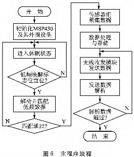 系统软件主要由初始化程序、休眠设置程序、低频唤醒程序和无线发射程序组成。主程序流程如图6所示,初始化MSP430F149单片机及其外部设备后,首先进入休眠状态并打开中断。当接收到低频唤醒中断时,MSP430F149单片机解析并匹配低频数据,匹配完成后通过传感器探头进行水质数据采集,转换盒存储,再通过无线发射模块向阅读器发送数据,从而完成一次完整的水质数据的采集。