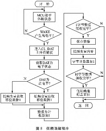 AS3933低频唤醒程序流程如图8所示。当电子标签工作时,由阅读器发送低频信号,AS3933接收到由曼彻斯特编码构成的唤醒接收数据后,唤醒引脚WAKE产生高电平,通过P0口唤醒MSP430F149。MSP430F149通过捕捉时钟管CL_DAT的上升沿中断和读取数据引脚DAT的电平状态,完成12字节低频数据的接收,整个低频唤醒过程约为0.2 s。