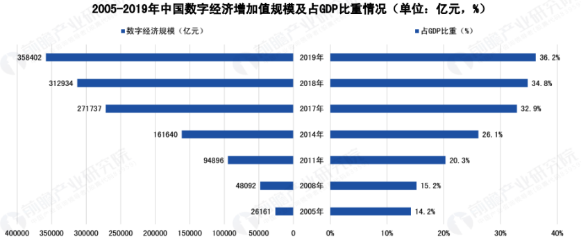 《2020年中国数字经济发展报告》显示,近年来,数字经济成为我国国民经济高质量发展的新动能,数字经济增加值规模由2005年的2.6万亿元增加至2019年的35.8万亿元。与此同时,数字经济在GDP中所占的比重逐年提升,由2005年的14.2%提升至2019年的36.2%。