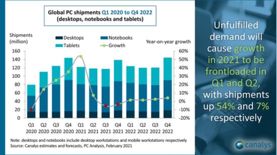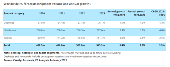 2021年03月08日 | Canalys预测:2021年全球 PC 市场总出货量或达4.968亿台