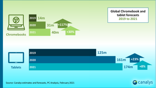 由于工人和学生的需求持续增长,去年的设备订单正在增加,但是供应问题将在今年全年持续存在,并且成为更高增长水平的主要制约因素。2021年的增长预计将在今年上半年实现,第一季度的出货量增长了54% ,第二季度增长了7% 。2021年,Chromebook和平板电脑将成为该行业的亮点,分别实现30% 和8% 的增长。