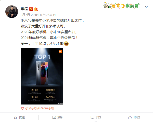 常程微博写到:“小米10是去年小米冲击高端的开山之作,收获了大量好评和多项认可。2020年度好手机,小米10实至名归。2021新年新气象,再来个升级新品!周一,上午10点,不见不散。”