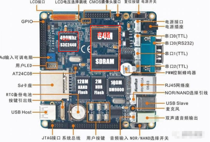 中间偏左上角是CPU,中间是RAM,然后还有ROM、网卡、串口、电源等。可以看出,嵌入式系统麻雀虽小,五脏俱全。