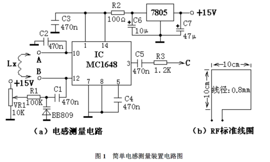 BB809是变容二极管,图中电位器VR1对+15V进行分压,调节该电位器可获得不同的电压输出,该电压通过R1加到变容二极管BB809上可获得不同的电容量。测量被测电感LX时,只需将LX接到图中A、B两点中,然后调节电位器VR1使电路谐振,在MC1648的3脚会输出一定频率的振荡信号,用频率计测量C点的频率值,就可通过计算得出LX值。
