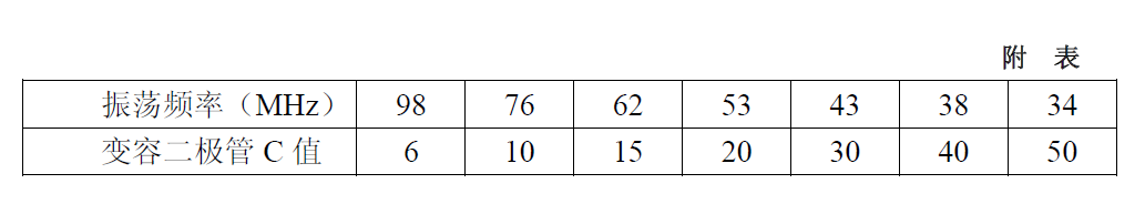 为了校准变容二极管与电位器之间的电容量,我们要再自制一个标准的方形RF(射频)电感线圈L0。如图6—7(b)所示,该标准线圈电感量为0.44μH。校准时,将RF线圈L0接在图(a)的A、B两端,调节电位器VR1至不同的刻度位置,在C点可测量出相对应的测量值,再根据上面谐振公式可算出变容二极管在电位器VR1刻度盘不同刻度的电容量。附表给出了实测取样对应关系。