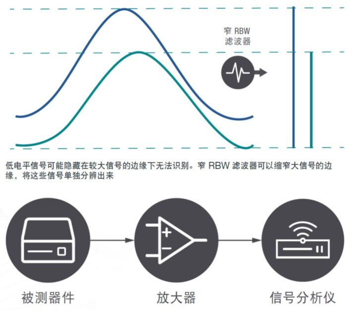 通过尽量减少输入衰减并添加前置放大器,这样可以让信号电平远远超过分析仪的噪声。窄分辨率带宽可以降低测量噪声,缩窄大信号的边缘,使您可以分辨出非常接近的信号。应用这些技巧可以提高信噪比,使不同的信号清晰地显露出来,从而让您找到低电平杂散。