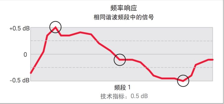 在最差的相对测量情形下,基波信号可能出现在最高频率响应的点上,而我们想要测量的谐波信号则出现在最低频率响应的点上,相反的情况也会以同样的概率发生。因此,如果相对频响指标是如图 1-2 所示的 ±0.5 dB 的话,那么总的不确定度将是它的 2 倍,即 ±1.0 dB。