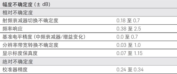 在进行不同类型的测量时最理想的做法是考虑所有已知的不确定度然后确定哪些不确定度可以忽略不计。表 4-1 中的数值给出了多种不同频谱仪的指标范围。