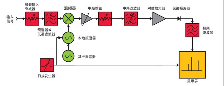 当输入信号转换至中频后,会通过中频增益放大器和中频衰减器以补偿射频衰减器设置的变化和混频器变频损耗,于是输入信号的幅度都是参考屏幕标度盘最上方的一行,即众所周知的基准电平。