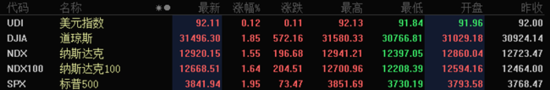 美股方面,道琼斯工业平均指数上涨572.16点,涨幅为1.85%,报31496.30点。纳斯达克综合指数大涨196.68点,涨幅为1.55%,报12920.15点。标普500指数收涨73.47点,涨幅为1.95%,报3841.94点。