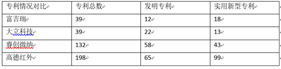通过对比发现,富吉瑞与大立科技在专利总数方面,远低于睿创微纳和高德红外两家厂商,在发明专利方面,富吉瑞仅12项,处于行业劣势。