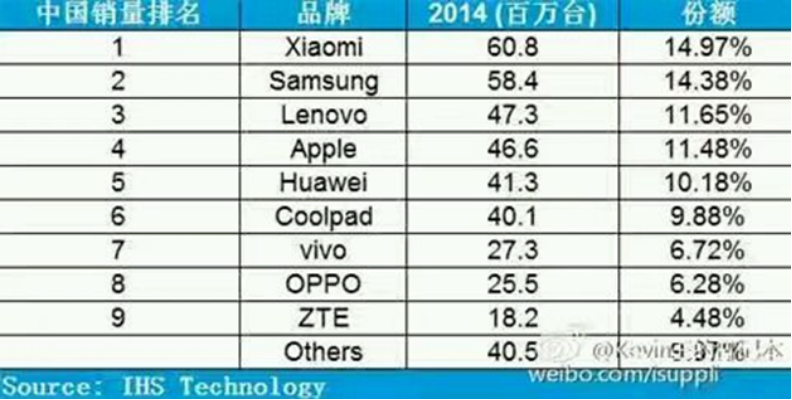 现在的realme像极了当时的小米,2011年小米正式进军中国手机市场,经过一番迅猛发展,在三年后,也就是2014年小米正式登顶中国手机市场,在知名市场调研机构IHS发布的2014年中国手机销量排名报告中,小米以6080万部的销量排名第一,市场份额为14.97%。