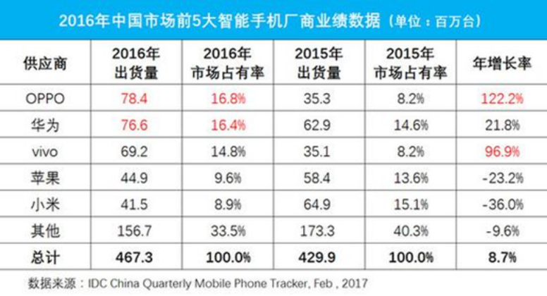 而在后来,由于市场竞争激烈、组织架构管理等原因,小米高速增长的进程被打断。在2016年小米在中国的出货量为4150万台,跟2015年出货量6490万台相比,同比下滑36%,市场排名下降至中国第五,痛失中国手机市场第一的宝座。