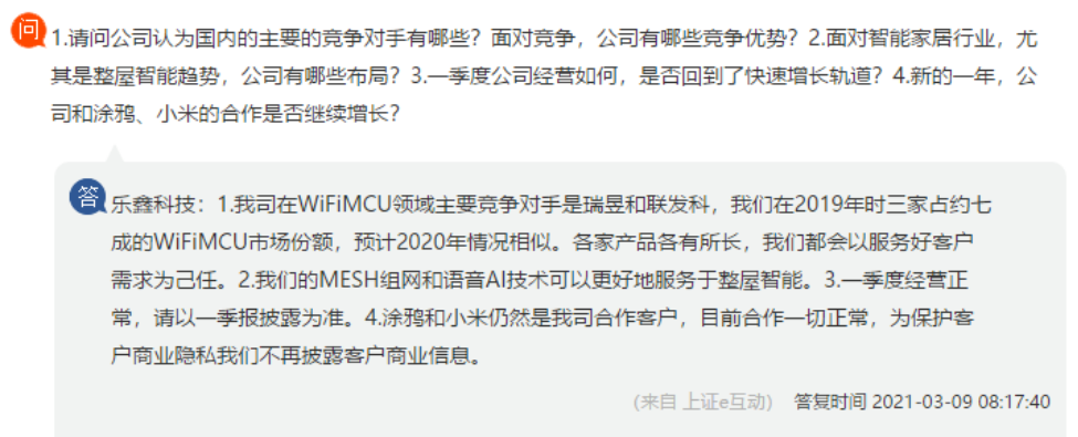 2021年03月09日 | 乐鑫科技:涂鸦和小米仍是合作客户,目前合作一切正常